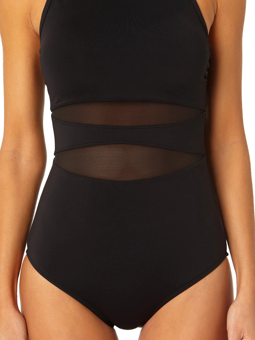 Swim in style in the Anne Cole High Neck Mesh One Piece Swimsuit. The mesh cut outs give the illusion of a two piece while having the comfortable and secure fit of a one piece. Complete with partway adjustable, criss crossed straps.