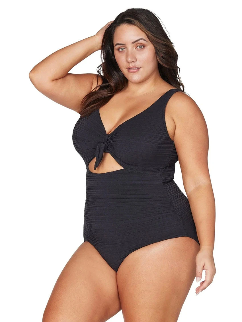 Get a swimwear that will contour to your curves in the Artesands Cezanne One Piece Swimsuit. Featuring underwired cups, faux tie with keyhole, 360 degree power mesh for shaping and support, and moderate bottom coverage – the perfect swimwear for lounging at the beach or swimming in the pool.