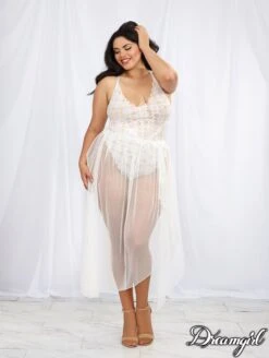 A lace teddy with a V neckline and high cut leg openings is perfectly balanced by the sheer, removable maxi skirt. Perfectly on-trend, mix and match these items in the bedroom, or dare to bare and wear them out on the town!
