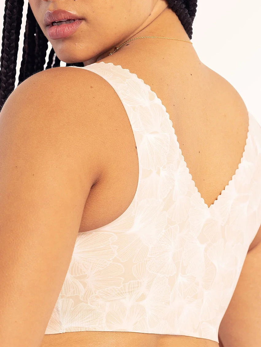 This new design from Evelyn & Bobbie features a deeper v-neck and scalloped edges in the front and back. It keeps the same smooth wireless lift as the Defy with elevated style and cleavage.
