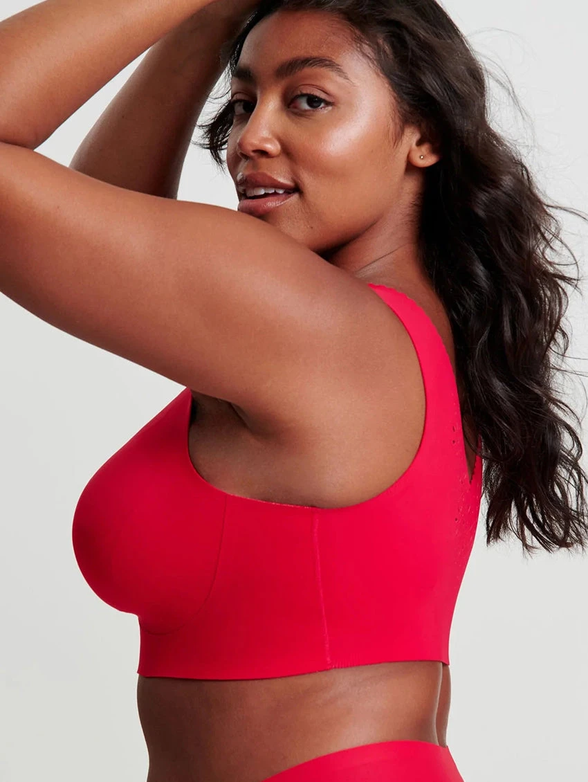 This new design from Evelyn & Bobbie features a deeper v-neck and scalloped edges in the front and back. It keeps the same smooth wireless lift as the Defy with elevated style and cleavage.