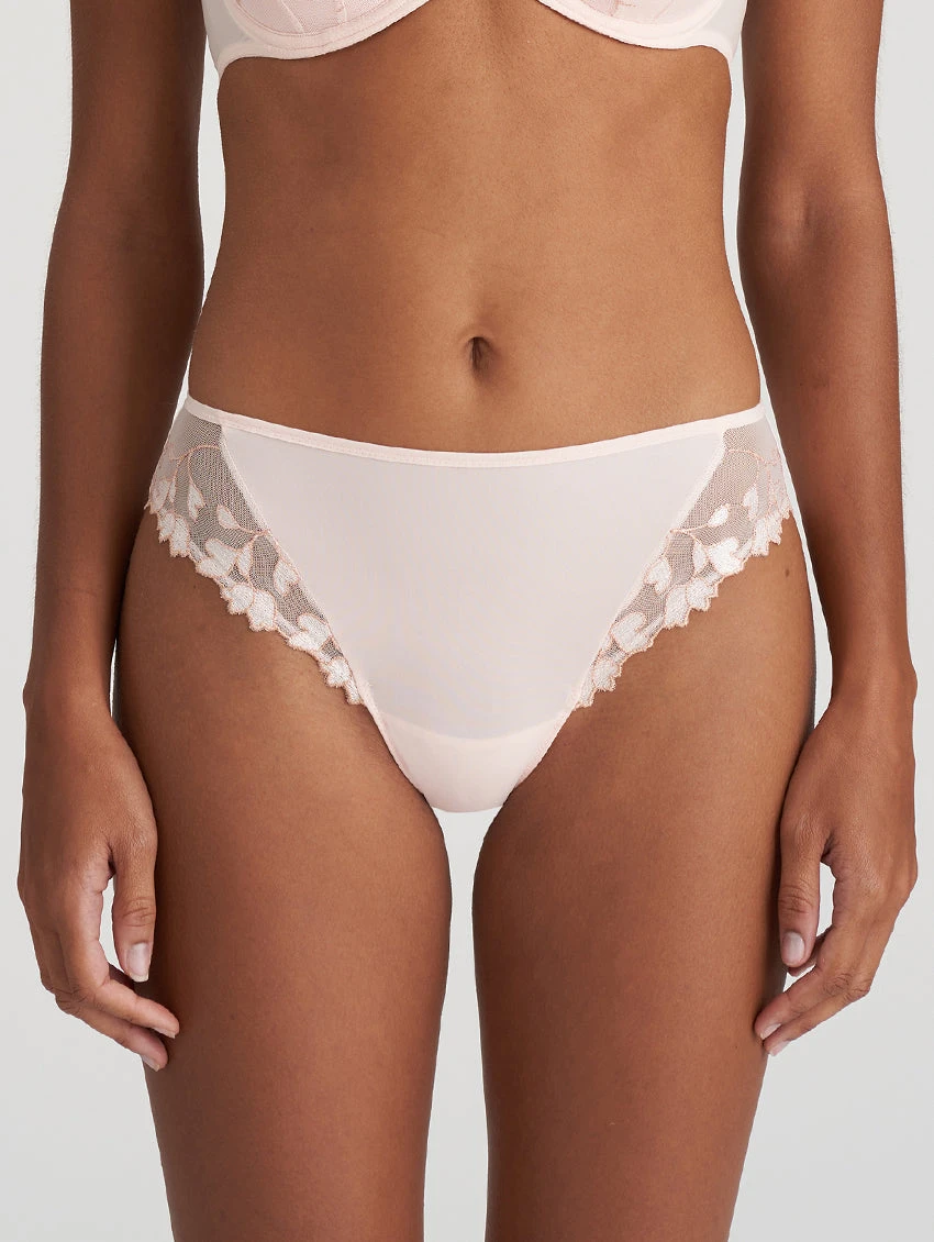 The Leda Rio Briefs are the classic Rio brief cut from Marie Jo with a new twist. These feature elegant floral embroidery at the hips and comfy seamless fabric at the back. Pairs perfectly with the matching Leda Padded Plunge Bra.