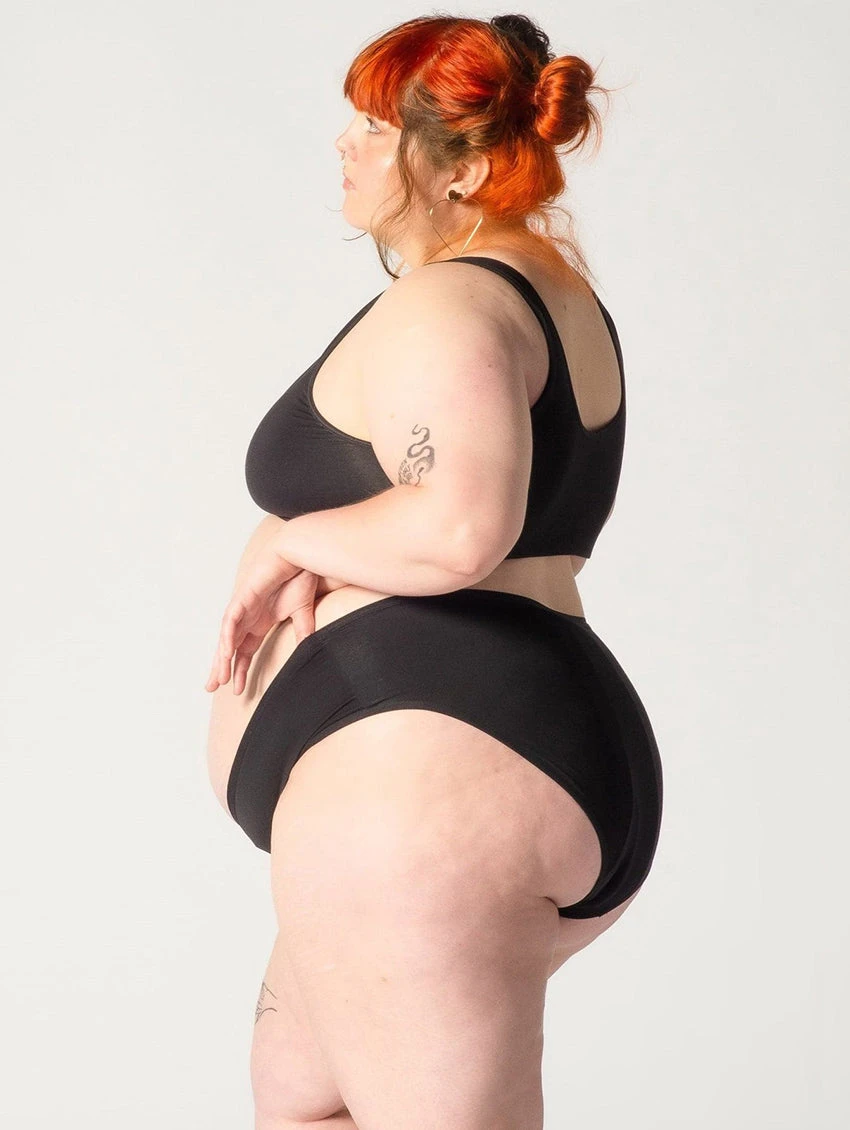 Revol Cares makes reliable leak proof period undies that are safe, sustainable, and a dream to wear. The Margo is a mid-rise bikini brief that has their regular protection rating. This incredible bikini brief can absorb up to 30mL of liquid, keeping you safe and dry all day or night while having a cheeky cut that works great under most clothes and isn’t bulky. What makes this period underwear so special is its full coverage protection. The ultra absorbent (and antimicrobial) cotton and bamboo fabric is lined with breathable cotton PUL, which keeps everything contained, and spans from front band to back band.