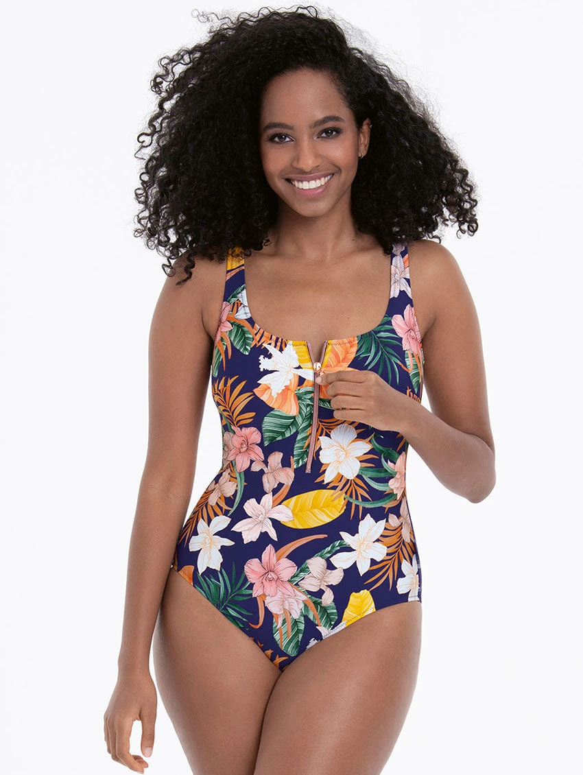 The Rosa Faia Front Zip One Piece Swimsuit is sporty yet trendy piece with a tropical floral print and a front zip. Made wire-free, lined bust, low back, and adjustable straps will become your new go-to for the beach or at the pool.